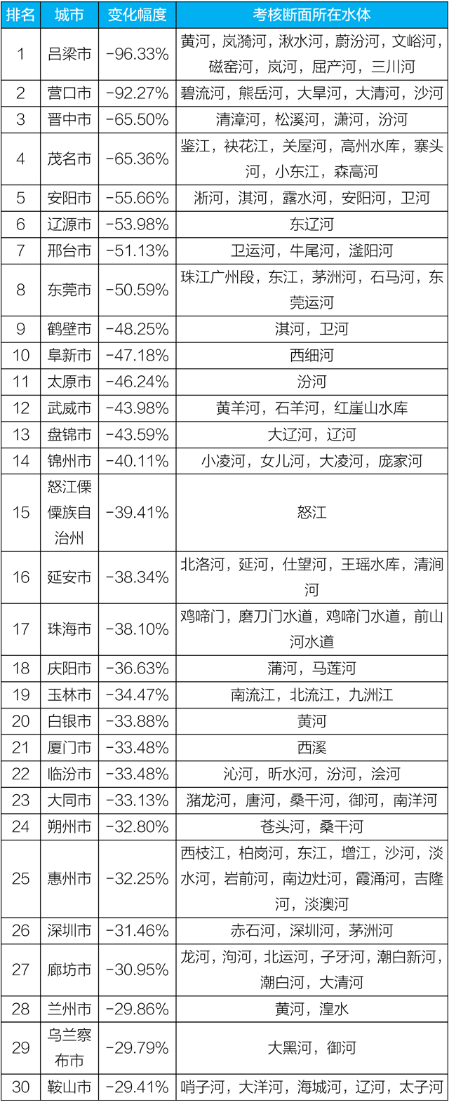 2020年1-3月國(guó)家地表水考核斷面水環(huán)境質(zhì)量變化情況排名前30位城市及所在水體