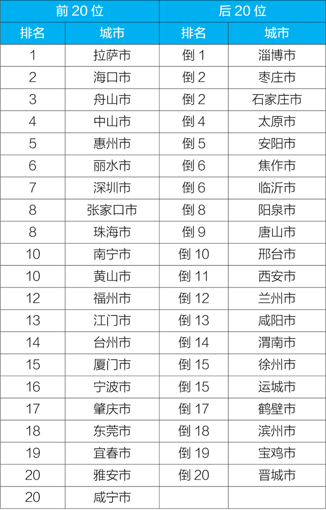 3月,168個(gè)重點(diǎn)城市中淄博、棗莊、石家莊市等城市空氣質(zhì)量相對(duì)較差(從倒數(shù)第1名至倒數(shù)第20名);拉薩、???、舟山市等城市空氣質(zhì)量相對(duì)較好(從第1名至并列第20名,見附表7)。