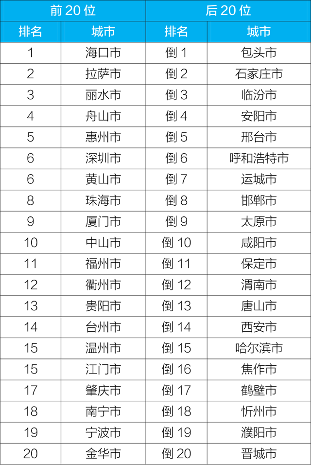 1-3月,168個(gè)重點(diǎn)城市中包頭、石家莊、臨汾市等城市空氣質(zhì)量相對(duì)較差(從倒數(shù)第1名至倒數(shù)第20名);??凇⒗_、麗水市等城市空氣質(zhì)量相對(duì)較好(從第1名至第20名,見附表8)。
