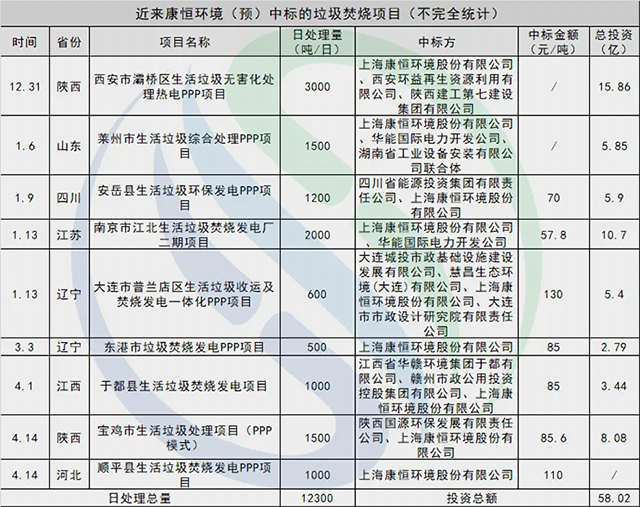 中國(guó)固廢網(wǎng)曾不完全統(tǒng)計(jì)發(fā)現(xiàn),從2019年年末至4月初的3個(gè)月內(nèi),康恒環(huán)境步履不停,已在6省7市拿下了7個(gè)垃圾焚燒項(xiàng)目,項(xiàng)目投資總額近50億。昨日,預(yù)中標(biāo)了寶雞8億生活垃圾處理PPP項(xiàng)目與順平縣生活垃圾焚燒發(fā)電PPP項(xiàng)目(未在公開資料中查找到投資金額,暫且忽略不計(jì))的康恒環(huán)境,近來(lái)入手垃圾焚燒項(xiàng)目總額已逾58億。