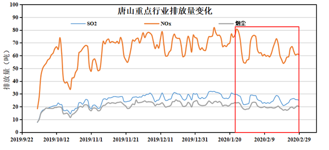 通過分析唐山市電力、鋼鐵、焦化、水泥、平板玻璃五大行業(yè)在線監(jiān)測數(shù)據(jù)發(fā)現(xiàn),秋季(2019.10.1)以來唐山市重點行業(yè)污染排放除在個別管控時段有所下降外,其余時間基本穩(wěn)中有漲。但春節(jié)疫情防控(2020.1.24)開始后,污染物排放量仍有高值出現(xiàn),且總體較前幾個月僅略有下降。因此,占比較高的重污染行業(yè)污染排放變化不大,仍是疫情防控期間PM2.5濃度未出現(xiàn)明顯降低的主觀因素。