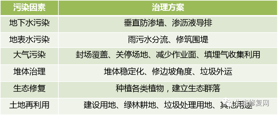 ? 三大任務:污染控制、封場整治、生態(tài)修復? 可根據污染現(xiàn)狀、環(huán)境容量、投資、陳垃圾治理方式等制定治理方案