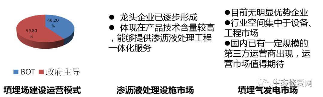 ? 填埋處理設施投資建設運營由政府主導逐步轉向市場化? 初步形成三大市場:垃圾填埋場建設與運營市場、垃圾填埋氣體利用市場、垃圾滲瀝液處理市場? 場地修復、生態(tài)景觀修復市場空間有待釋放