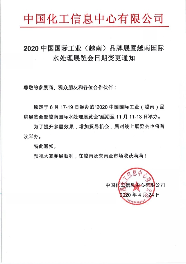 結(jié)合目前全球疫情發(fā)展趨勢,也為了較大限度上確保參展商與觀眾的生命健康安全,越南國際水處理展主辦方中國化工信息中心經(jīng)與展館方溝通確認,現(xiàn)將展期變更如下: