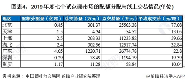 2019 年七個試點(diǎn)碳市場共分配配額11.66 億噸;完成線上配額交易量2 187 萬噸,達(dá)成交易額7.73 億元;成交均價為35.39 元/噸。配額分配總量和配額線上成交總量較2018 年有所減少,但成交總額和成交均價有所提升。