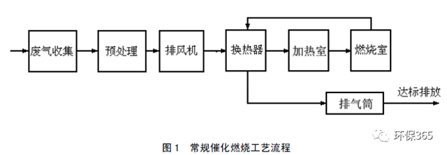 根據(jù)對(duì)廢氣加熱方式的不同,催化燃燒工藝可以分為常規(guī)催化燃燒工藝(見(jiàn)圖 1)和蓄熱催化燃燒工藝(見(jiàn)圖 2)。