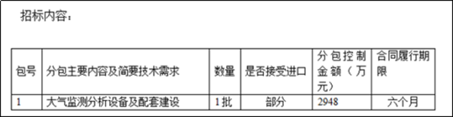 根據(jù)招標(biāo)公告可知,所需要的大氣監(jiān)測(cè)分析設(shè)備等部分可接受進(jìn)口,合同履行期限為6個(gè)月。另外,該項(xiàng)目不接受聯(lián)合體投標(biāo)。