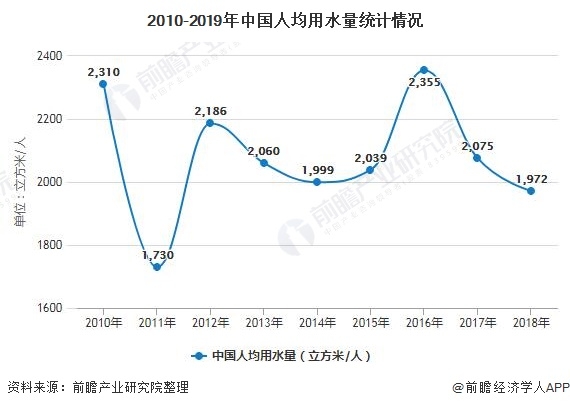 我國(guó)水資源長(zhǎng)期面臨水資源分布不均、人均占有量少、水資源利用率低的問(wèn)題。數(shù)據(jù)顯示,2010-2019年,我國(guó)用水量大約維持在6000億立方米左右,近兩年的用水總量雖然負(fù)增長(zhǎng),但總量依然較大。同時(shí),2010-2018年,我國(guó)人均水資源量呈波動(dòng)下降趨勢(shì),2018年,中國(guó)人均用水量下降至1972立方米/人。