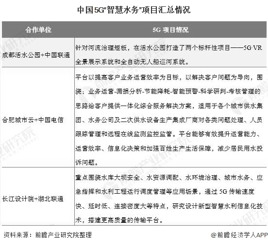 此外,各地水務(wù)集團(tuán)在加快“5G+智慧水務(wù)”項(xiàng)目的落地和進(jìn)程。例如,2019年7月,四川首個(gè)5G“智慧水務(wù)”項(xiàng)目亮相,項(xiàng)目中的5G VR全景展示系統(tǒng)和全自動(dòng)無(wú)人船巡河系統(tǒng)引人矚目。