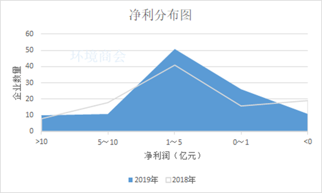 從凈利分布來(lái)看。2019年,10家企業(yè)凈利超10億,盈利水平在5億到10億之間的企業(yè)11家,這一數(shù)字較2018年減少7家。此外,近半數(shù)企業(yè)的歸母凈利集中在1億~5億之間,而盈利水平在1億以下的企業(yè)有26家,這兩部分企業(yè)數(shù)據(jù)合計(jì)達(dá)77家,較2018年增加了20家。虧損企業(yè)數(shù)量則相對(duì)減少,為11家,包括津膜科技、鐵漢生態(tài)、天翔環(huán)境、凱迪生態(tài)、盛運(yùn)環(huán)保、中創(chuàng)環(huán)保等,這些企業(yè)除鐵漢生態(tài)、津膜科技外基本在2018年已經(jīng)陷入虧損狀態(tài),至今尚未扭轉(zhuǎn),虧損最為嚴(yán)重的是盛運(yùn)環(huán)保,虧損額度達(dá)20億。