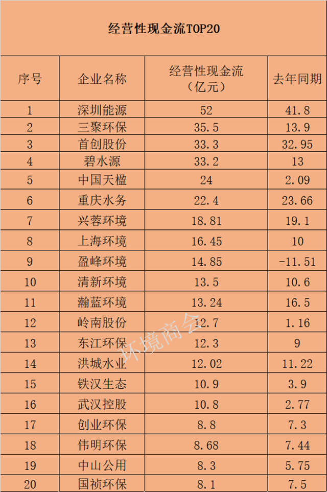 一是具有穩(wěn)定收益的地方國(guó)資現(xiàn)金流狀況良好。在經(jīng)營(yíng)性現(xiàn)金流排行的前20名中,首創(chuàng)股份、重慶水務(wù)、興蓉環(huán)境、上海環(huán)境、瀚藍(lán)環(huán)境、洪城水業(yè)、中山公用等企業(yè)表現(xiàn)出一個(gè)共同的特征--現(xiàn)金流穩(wěn)定且相對(duì)充裕。這些企業(yè)大部分都又很明顯的屬地特征,從地方成長(zhǎng)起來(lái),手握大量能提供穩(wěn)定現(xiàn)金流的水務(wù)或固廢等項(xiàng)目,與此同時(shí),在上一輪PPP激戰(zhàn)中它們多數(shù)參與不深或并未參與,因此,在這輪危機(jī)中現(xiàn)金流受影響明顯小很多,抗沖擊能力強(qiáng)勁。