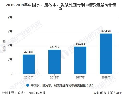 污水處理技術(shù)是推動污水處理行業(yè)高效發(fā)展的關(guān)鍵因素。數(shù)據(jù)顯示,2015年以來,我國水、廢污水、泥漿的處理專利申請受理量逐年提升,特別是2018年,相關(guān)專利受理量達(dá)5.79萬項,同比增加47.45%,可見我國的污水處理技術(shù)正逐步提升。