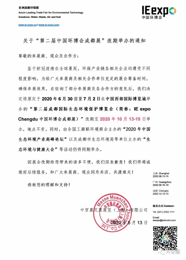 原定于2020年6月30日至7月2日在中國(guó)西部國(guó)際博覽城舉辦的“第二屆中國(guó)環(huán)博會(huì)成都展IE expo Chengdu”改期至2020年10月13-15日,舉辦地點(diǎn)不變。同時(shí),