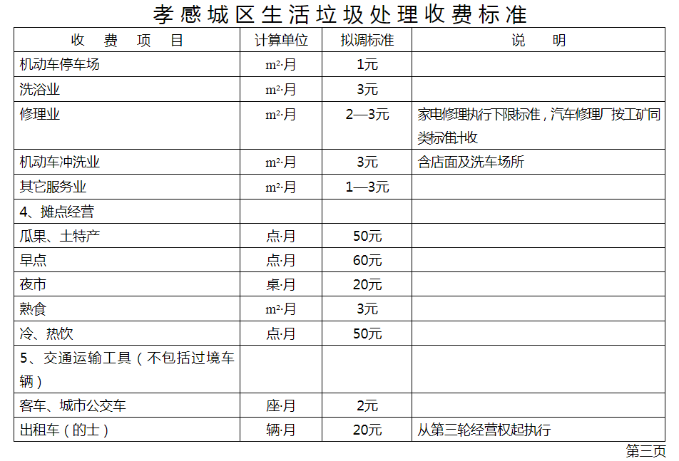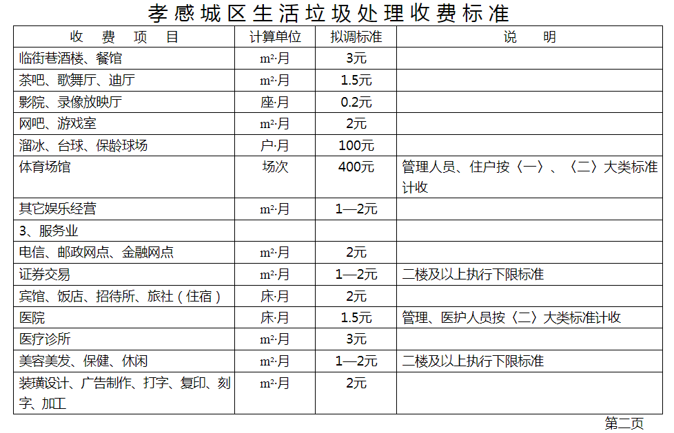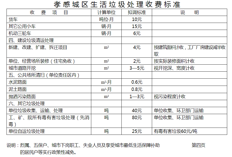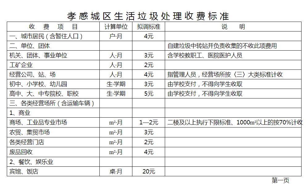 湖北省孝感市城市管理執(zhí)法委員會公開的生活垃圾處理收費標準為: