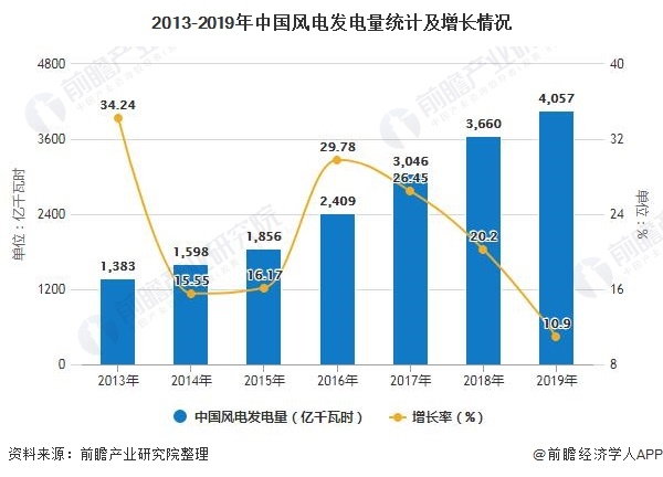 4、2019年中國風(fēng)力發(fā)電量突破4000億千瓦時