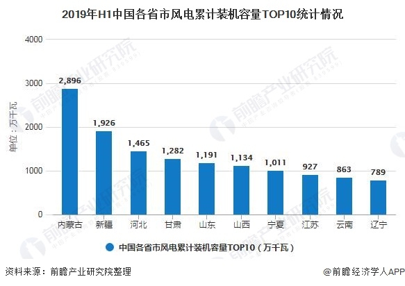 截止2019年6月底,全國十大風(fēng)電裝機省份分別是:內(nèi)蒙古2896萬千瓦、新疆1926萬千瓦、河北1465萬千瓦、甘肅1282萬千瓦、山東1191萬千瓦、山西1134萬千瓦、寧夏1011萬千瓦、江蘇927萬千瓦、云南863萬千瓦、遼寧789萬千瓦。