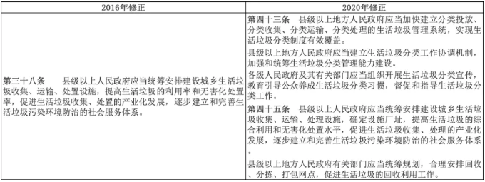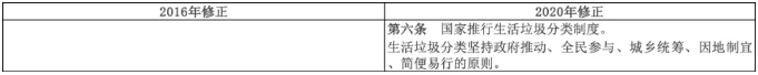 新法第六條,首次在固廢法中提出垃圾分類制度,明確了垃圾分類在固體廢物管理中的地位。當前生活垃圾分類相關最高級別文件是《城市市容和環(huán)境衛(wèi)生管理條例》,是由國務院制定的行政法規(guī),其法律效力低于由全國人大制定的《中華人民共和國固體廢物污染環(huán)境防治法》。此次新法中明確提出垃圾分類相關規(guī)定為所有垃圾分類相關條例、法規(guī)提供上位支持。
