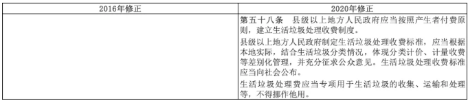 首提生活垃圾收費要求。這一條文與國家發(fā)展改革委關于創(chuàng)新和完善促進綠色發(fā)展價格機制的意見中關于生活垃圾處理費的指導思想高度一致(參考鏈接:透視發(fā)改943文:垃圾收費、分類雙管齊下,固廢管理進入體系化)。E20研究院固廢產業(yè)研究中心負責人潘功博士認為,對生活垃圾的計量收費和差別化收費,融入了生活垃圾分類理念,明確了“污染者付費”原則,是推動生活垃圾分類的有效手段、有力手段、強制手段。全面垃圾收費的號角,伴隨強制垃圾分類的“再擴容”和固廢法修訂的再次強調而正式吹響,通過全面建立覆蓋成本并合理盈利的固體廢物處理收費機制,加快建立有利于促進垃圾分類和減量化、資源化、無害化處理的激勵約束機制,將成為垃圾分類工作的一個重要突破口。