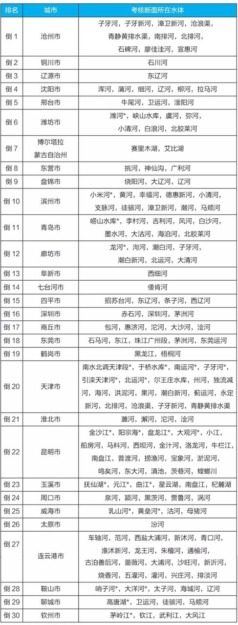 參加排名的全國地級(jí)及以上城市,覆蓋2050個(gè)國控?cái)嗝?其中1940個(gè)為國家地表水考核斷面,110個(gè)為入??刂茢嗝?。4月,全國地級(jí)及以上城市中,玉樹、河源、柳州等30個(gè)城市國家地表水考核斷面水環(huán)境質(zhì)量相對(duì)較好(從第1名到第30名),滄州、銅川、遼源等30個(gè)城市國家地表水考核斷面水環(huán)境質(zhì)量相對(duì)較差(從倒數(shù)第1名到倒數(shù)第30名);1-4月,全國地級(jí)及以上城市中,玉樹、柳州、金昌等30個(gè)城市國家地表水考核斷面水環(huán)境質(zhì)量相對(duì)較好(從第1名到第30名),銅川、滄州、邢臺(tái)等30個(gè)城市國家地表水考核斷面水環(huán)境質(zhì)量相對(duì)較差(從倒數(shù)第1名到倒數(shù)第30名);詳細(xì)見附表1~附表4。
