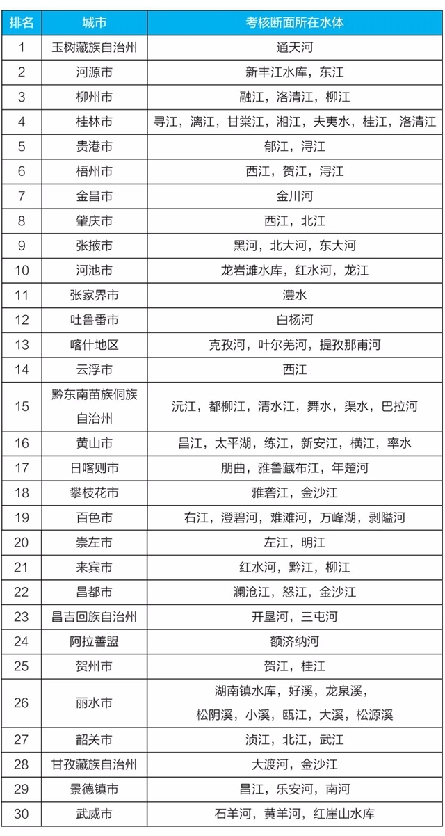 2020年1-4月國家地表水考核斷面水環(huán)境質(zhì)量狀況排名前30位城市及所在水體