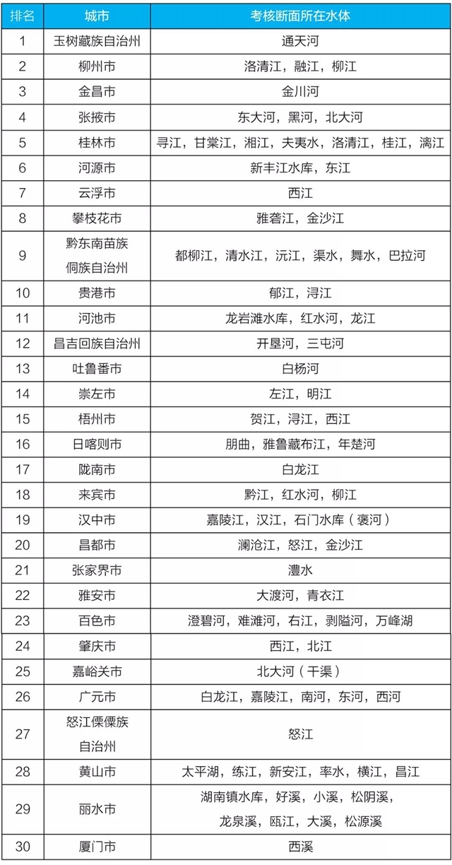 2020年4月國家地表水考核斷面水環(huán)境質(zhì)量狀況排名前30位城市及所在水體