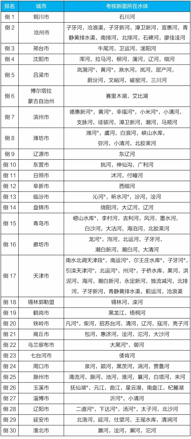 2020年1-4月國家地表水考核斷面水環(huán)境質(zhì)量狀況排名后30位城市及所在水體