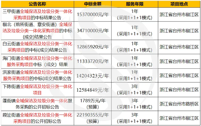 5月15日,白云街道全域保潔及垃圾分類一體化采購項(xiàng)目發(fā)布中標(biāo)結(jié)果公告。第一中標(biāo)候選人為:浙江聯(lián)運(yùn)環(huán)境工程股份有限公司,中標(biāo)金額:12865920.00元/年。服務(wù)期為:1年(采用1+1+1模式)。