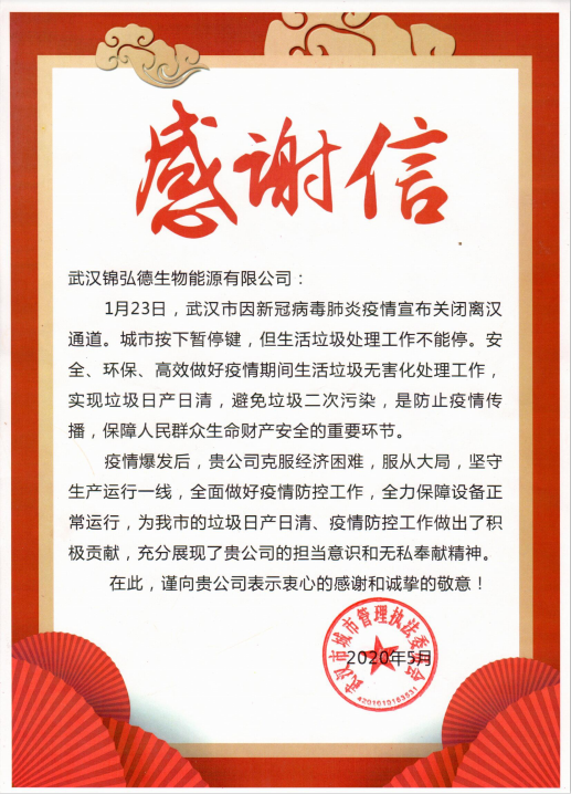 5月14日,武漢市城管委為錦瑞環(huán)境武漢餐廚項目送上錦旗與感謝信,對該企業(yè)在抗疫工作中做出的貢獻表示衷心的感謝與誠摯的敬意。