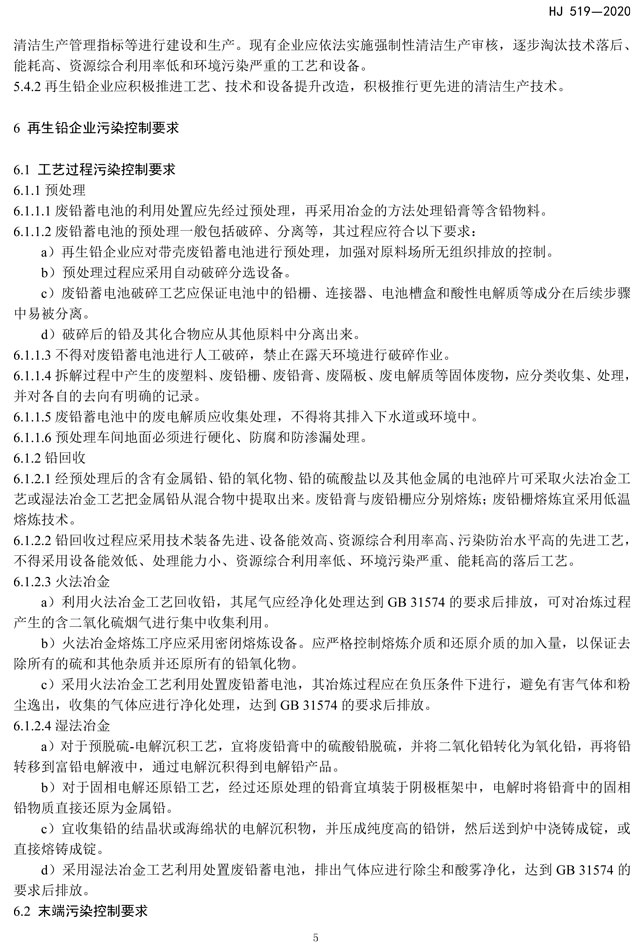 廢鉛蓄電池處理污染控制技術(shù)規(guī)范(HJ 519——2020 代替 HJ 519-2009)