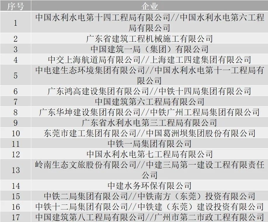 2020年4月,東莞市東江下游片區(qū)水污染綜合治理工程(污水收集系統(tǒng)完善工程)開始正式招標(biāo),約有50余家企業(yè)入圍資格預(yù)審,分別是: