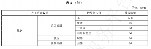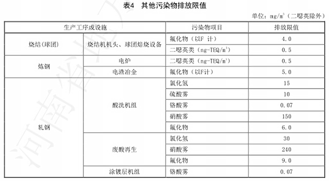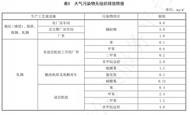 對(duì)于有組織排放,《鋼鐵工業(yè)排放標(biāo)準(zhǔn)》要求顆粒物排放濃度根據(jù)不同的生產(chǎn)工序或設(shè)施為10mg/m3、20mg/m3,二氧化硫的排放限值分別為35mg/m3和50mg/m3,氮氧化物燒結(jié)工序排放限值為50mg/m3,其他工序氮氧化物排放限值則為150mg/m3。其他污染物排放限值如下: