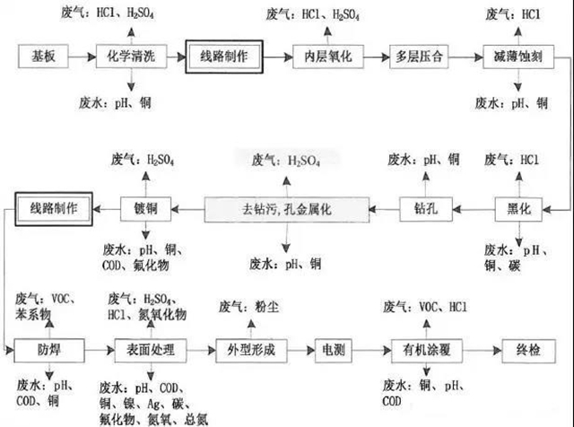 覆銅板生產(chǎn)工藝屬于無水工藝,除冷卻水、檢驗(yàn)檢測(cè)部門會(huì)產(chǎn)生少量污水外,其他生產(chǎn)流程不會(huì)產(chǎn)生污水。生產(chǎn)過程產(chǎn)生的污染物主要在廢氣方面,較多來自于使用丙酮、甲苯等有機(jī)溶劑的揮發(fā)。