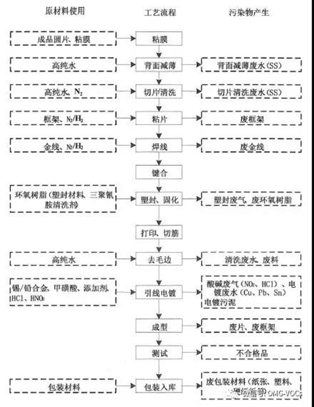 封裝工藝產(chǎn)生的廢氣較為簡(jiǎn)單,主要是酸性氣體、環(huán)氧樹脂及粉塵。酸性廢氣主要產(chǎn)生于電鍍等工藝;烘烤廢氣則產(chǎn)生于晶粒粘貼、封膠后烘烤過程;劃片機(jī)在晶片切割過程中,產(chǎn)生含微量砂塵的廢氣。