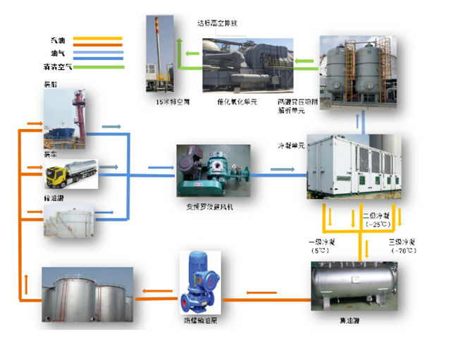 在產(chǎn)品罐區(qū)及碼頭裝船區(qū),油氣經(jīng)過“收集-輸送-冷凝(吸收)-催化氧化”等工藝處理,最終達(dá)標(biāo)排放。