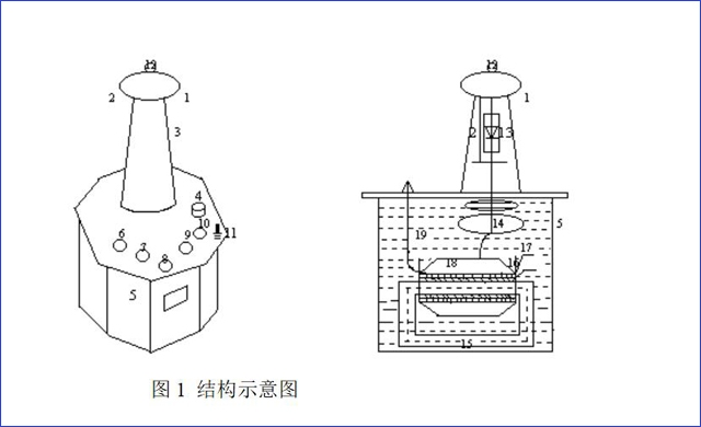 1-均壓球;2-硅堆短路桿;3-高壓套管;4-油閥;5-殼體;6、7-調(diào)整電壓輸入a、x端子;8、9-儀表測量E、F端子;10-高壓尾X端子;11-變壓器外殼接地端;12-高壓輸出A端子;13-高壓整流硅堆;14-內(nèi)部均壓環(huán);15-變壓器鐵芯;16-初級低壓繞組;17-測量儀表繞組;18-二次級高壓繞組;19-變壓器油。