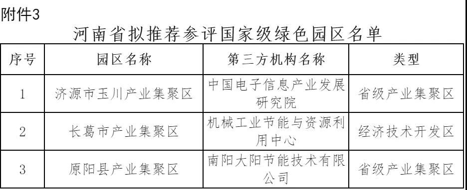 3.河南省擬推薦參評國家級綠色園區(qū)名單