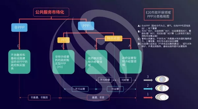 E20研究院曾針對(duì)市政環(huán)保領(lǐng)域提出市政環(huán)保PPP四分類(lèi)理論(圖3所示),其中c類(lèi)非特許經(jīng)營(yíng)的政府購(gòu)買(mǎi)型PPP(PFI)包含管網(wǎng)融資建設(shè)、不含污水廠的黑臭水體治理和海綿城市、土壤修復(fù)、農(nóng)村污水或垃圾治理等。