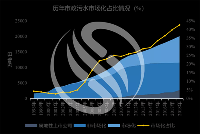 市政基礎(chǔ)設(shè)施的建設(shè)成為地方政府融資平臺(tái)的任務(wù),這些市政基礎(chǔ)設(shè)施建設(shè)項(xiàng)目絕大多數(shù)被地方縣、市級(jí)屬地化平臺(tái)拿下,這從圖2可以明顯看出。1998年以來(lái),市政污水市場(chǎng)化率整體上呈增長(zhǎng)趨勢(shì),其中從2008年開(kāi)始,屬地性上市公司的占比不斷增長(zhǎng)。