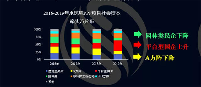 這從E20研究院數(shù)據(jù)中心對(duì)2016~2019年水環(huán)境項(xiàng)目社會(huì)資本中標(biāo)情況的統(tǒng)計(jì)分析中也可以明顯看出(圖4所示)。2017年P(guān)PP被規(guī)范整頓之后,建筑型央企份額變化不大,而平臺(tái)型國(guó)企在水環(huán)境PPP項(xiàng)目中的占比逐漸增大;園林類(lèi)民企以及偏好投資運(yùn)營(yíng)項(xiàng)目的A方陣的占比逐漸下降,前者屬于前述的情況,以民營(yíng)企業(yè)為主的企業(yè)被迫退出,后者則來(lái)自這些企業(yè)(國(guó)資也占有優(yōu)勢(shì))的戰(zhàn)略性退出。