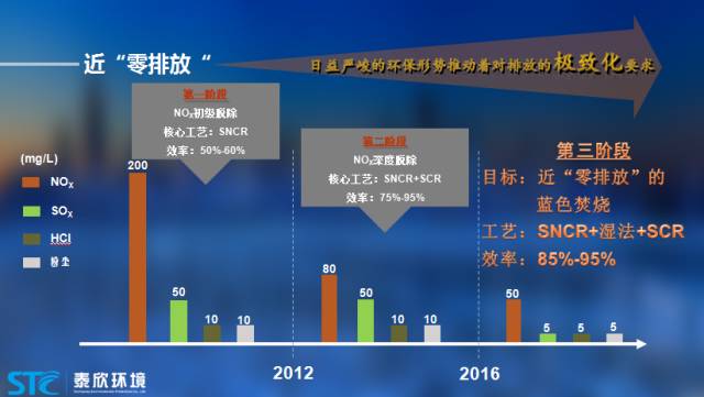 第一個(gè)階段,在2012年之前,我們比較傳統(tǒng)的處理工藝是SNCR,NOX初級(jí)脫除效率是50%-60%;第二個(gè)階段,2012年以后,由于引用了SCR,排放標(biāo)準(zhǔn)得到進(jìn)一步的降低,NOX深度脫除效率達(dá)75%-95%;第三個(gè)階段,到2016年,國(guó)家環(huán)保管理總體收緊,煙氣的排放標(biāo)準(zhǔn)越來越嚴(yán),要求近“零排放”的藍(lán)色焚燒。對(duì)于我們來說,就需要將工藝做進(jìn)一步改進(jìn)。我們判斷,低溫的SCR處理和濕法處理工藝的價(jià)值會(huì)凸顯出來。