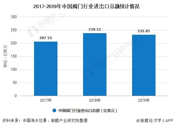 在我國目前的閥門市場上,除了低壓閥門已經達到國際市場能接受的水平外,高壓閥門仍然要依靠進口。在宏觀經濟下行,國際貿易形式不明朗的情形下,行業(yè)進出口數額有較大的波動,2018年,行業(yè)實現(xiàn)進出口總額239.52億美元,2019年進出口總額略微下滑,為233.85億美元,同比下滑2.37%。