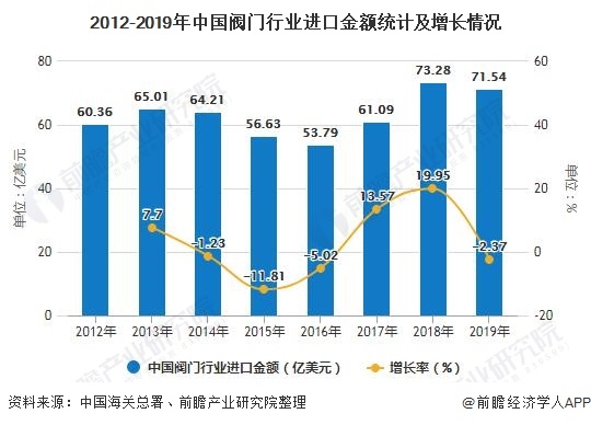 從進口金額的角度看,2018年閥門進口金額達到73.28億美元,同比增長19.95%;2019年進口金額為71.54億美元,同比下滑2.37%。