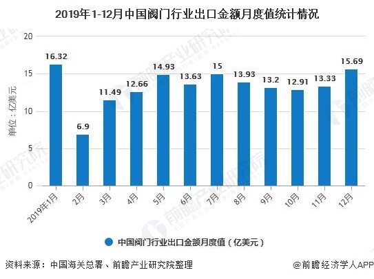 2019年1-12月,我國閥門行業(yè)出口金額波動較大,其中2019年1月實現(xiàn)最大出口金額,為16.32億美元;2019年2月出口金融最低,為6.9億美元。