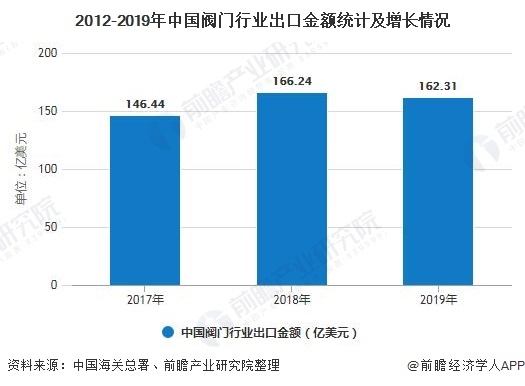 出口方面,據海關數據顯示,2017-2019年我國閥門行業(yè)出口金額呈波動上升趨勢,2018年為166.24億美元,同比增長13.5%;2019年,我閥門行業(yè)出口總額有所回落,為162.31億美元,同比下滑0.02%。
