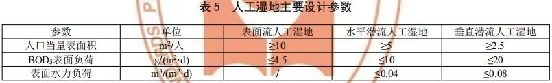8.2.4.5 人工濕地進水 COD 不宜大于 200mg/L,氨氮不宜大于 25mg/L,懸浮物不宜大于 80mg/L。表面流人工濕地水深一般為 20cm~80cm,水平潛流人工濕地水位則一般保持在基質(zhì)表面下方 5cm~20cm。人工濕地主要設(shè)計參數(shù)宜參考表 5 取值。
