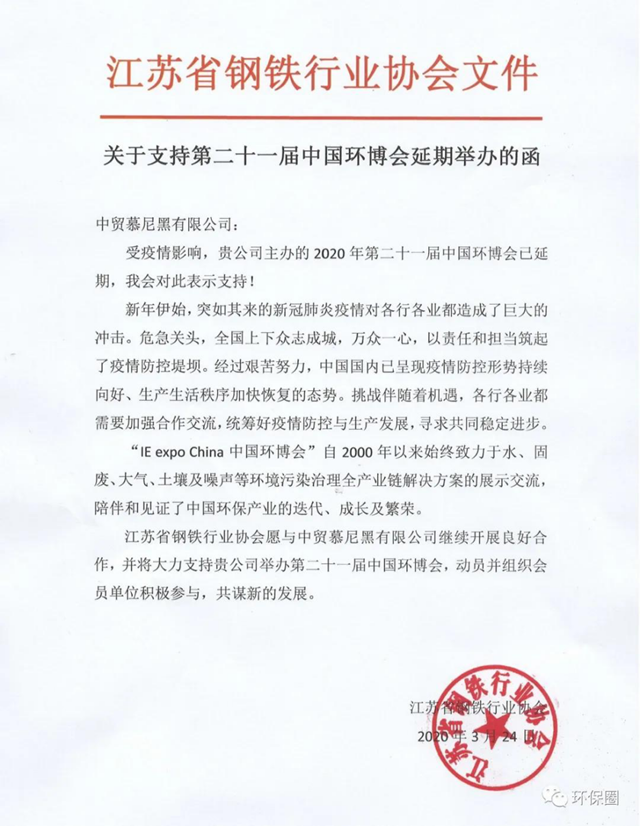 中國環(huán)博會(huì)被中國環(huán)保行業(yè)視為行業(yè)發(fā)展“風(fēng)向標(biāo)”,是亞洲一大的環(huán)境技術(shù)展示交流盛會(huì),至今已成功舉辦20屆。在突發(fā)疫情面前,中國環(huán)博會(huì)響應(yīng)國家和政府號(hào)召,積極配合疫情防控,為保證參展商和觀眾的健康安全,決定延期舉辦,這是履行企業(yè)社會(huì)責(zé)任和擔(dān)當(dāng)?shù)呐e措。我會(huì)在做好疫情防控的前提下,全力協(xié)助會(huì)員單位盡快復(fù)工復(fù)產(chǎn),齊心協(xié)力,共克時(shí)艱。我會(huì)也將大力支持中國環(huán)博會(huì),關(guān)注新動(dòng)態(tài),宣傳并組織會(huì)員單位積極參與。期待我們?cè)诘?1屆中國環(huán)博會(huì)IE expo China 2020見面!