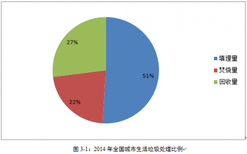 目前我國城市生活垃圾處理模式較為落后,形成了以填埋為主,焚燒為輔的終端處置格局。以2014年為例,當年全國城市生活垃圾產(chǎn)生總量24090.94萬噸,其中填埋量12286.4萬噸,占比51%;焚燒量5300萬噸,占比22%;回收量6504.54萬噸,占比27%(見圖3-1)。