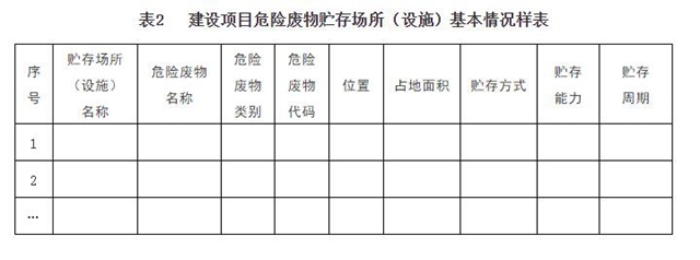 環(huán)境影響報(bào)告書(表)應(yīng)列表明確危險(xiǎn)廢物貯存場(chǎng)所(設(shè)施)的名稱、位置、占地面積、貯存方式、貯存容積、貯存周期等,樣表見表2。