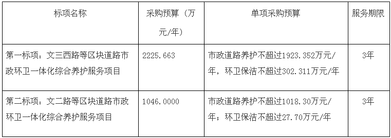 3、采購(gòu)人的采購(gòu)需求:主要內(nèi)容為道路(隨路橋梁)養(yǎng)護(hù)、道路保潔、巡查、維護(hù)、垃圾外運(yùn)處置、防汛、抗雪防凍應(yīng)急保障工作等,具體內(nèi)容和相關(guān)要求詳見招標(biāo)文件第四部分。本次招標(biāo)共二個(gè)標(biāo)項(xiàng),投標(biāo)人可以就上述項(xiàng)目的一個(gè)直至全部標(biāo)項(xiàng)進(jìn)行投標(biāo),同一標(biāo)項(xiàng)不得拆標(biāo)。