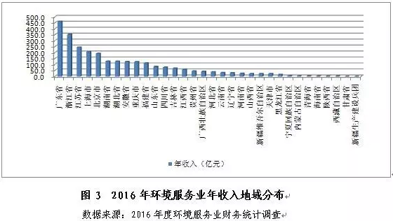 2016年,環(huán)境服務(wù)業(yè)在全國(guó)各地均有分布,且具有較高的區(qū)域集中度。54%以上的年收入來自于排名前5的地區(qū),僅2%來自排名最后的10個(gè)?。ㄗ灾螀^(qū)、直轄市),分布格局與2015年基本一致。廣東省、浙江省、江蘇省、上海市和北京市以其分別作為珠三角、長(zhǎng)三角的核心地區(qū)以及首都的地緣優(yōu)勢(shì),經(jīng)濟(jì)基礎(chǔ)雄厚、體制環(huán)境優(yōu)渥、公眾環(huán)境意識(shí)較高、環(huán)境管理要求相對(duì)嚴(yán)格,成為全國(guó)環(huán)境服務(wù)業(yè)年收入的主要貢獻(xiàn)者。